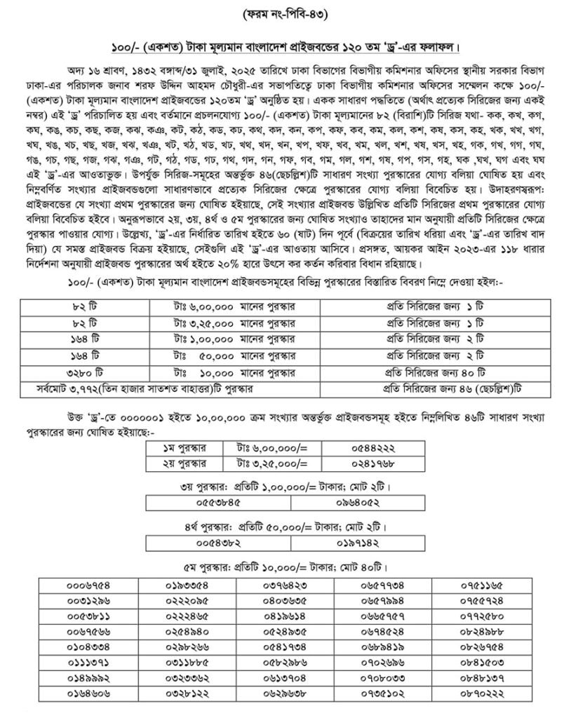 Bangladesh Bank 120th 100Tk Prize Bond Draw Result 2025 will broadcast by the Bangladesh Bank on 31 July 2025 at Dhaka Commissioner Conference Room. After that, the result of 100Tk Prize Bond Draw 2025 will available online.